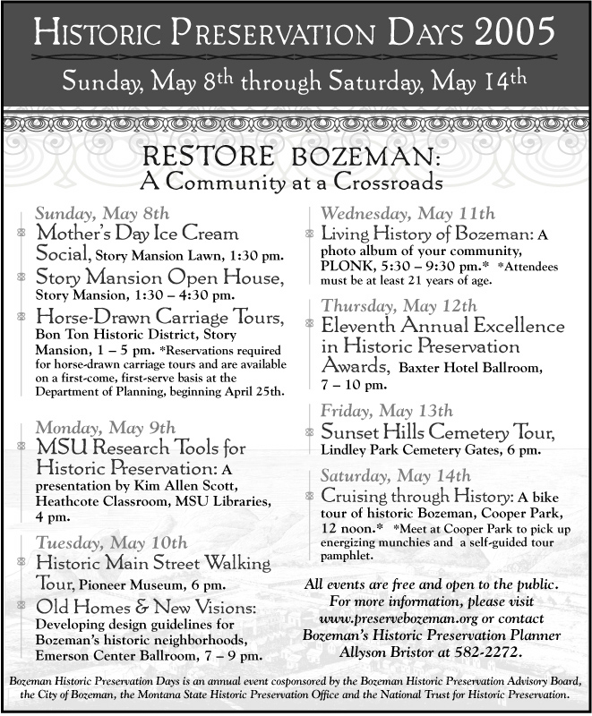 HPAB has expanded these celebrations to the entire month of May. Stay tuned for event announcements as May approaches. In the meantime, visit our Historic Preservation Awards page to learn more about our annual awards program and how we honor those dedicated to preserving Bozeman's history and cultural heritage.