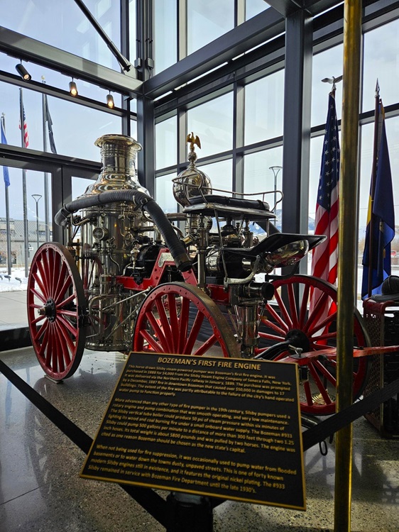 The Bozeman Fire Department takes great pride in both our current daily work and our rich history. Over the years, we have collected historical artifacts with the goal of showcasing the departments' growth and transformation over the past 140 years. This opportunity arose in 2020 with the establishment of a new Fire Station 1, located in the Bozeman Public Safety Center. The design of the station’s front office includes a display of the Bozeman Fire Department’s very first horse-drawn steam pumper, which was previously housed at the Museum of the Rockies.